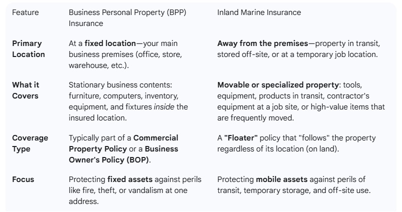 For example, a general contractor needs BPP for the office equipment at their headquarters, and Inland Marine for the bulldozer, power tools, and building materials at a construction site or being hauled on a flatbed trailer.